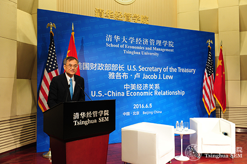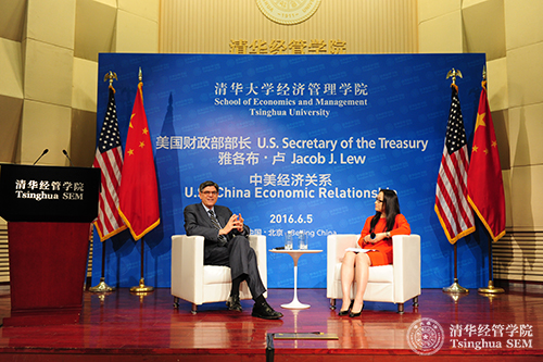 2016年6月5日下午,美国财政部部长雅各布·卢(Jacob J. Lew)来到清华大学经济管理学院,以中美经济关系为题对话。清华经管学院院长钱颖一教授致辞,《第一财经日报》副总编辑杨燕青博士主持对话。