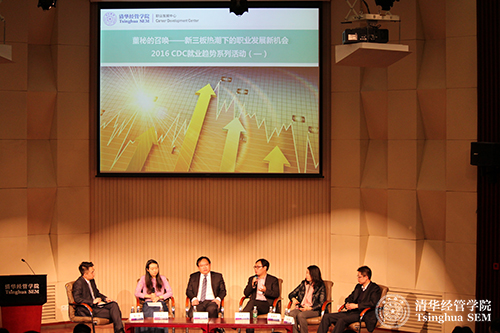 2016年1月10日,清华经管学院职业发展中心(以下简称“CDC”)携手清华MBA学生金融俱乐部在清华经管学院伟伦报告厅举办了主题为“董秘的召唤——新三板热潮下的职业发展机会”的分享活动。这是学院职业发展中心2016年就业趋势系列分享会的第一场活动。参与活动的五位嘉宾为现场260余名学生和校友解读了新三板热潮下涌现的各种职业发展机会,尤其是对董事会秘书(简称“董秘”)这一关键岗位的人才需求。