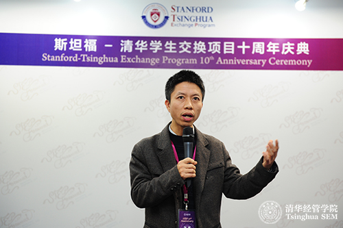 清华经管学院STEP项目首任学术指导教师、学院创新创业与战略系张帏教授在斯坦福-清华学生交换项目十周年庆典活动上发言
