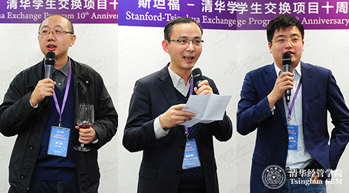 往届参与STEP项目的MBA校友在斯坦福-清华学生交换项目十周年庆典活动上发言(从左至右:刘欣、陈远明、赵建华)