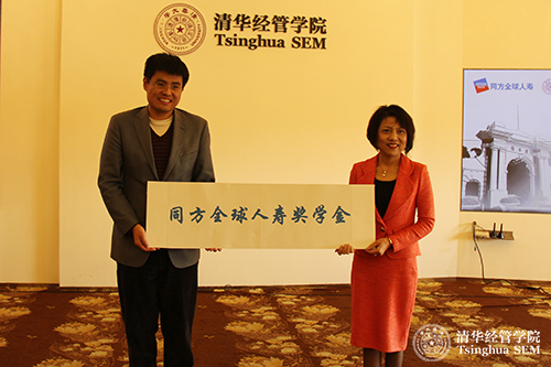清华经管学院副院长陈煜波教授(左)宣布同方全球人寿奖学金正式更名
