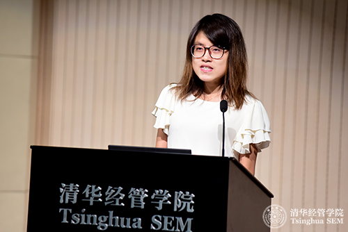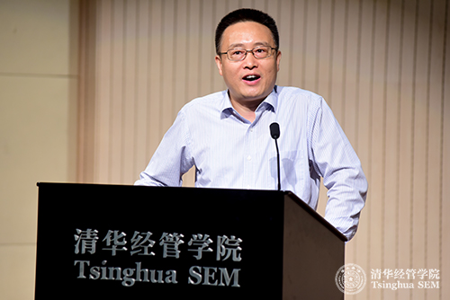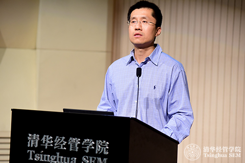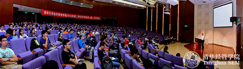 清华经管学院副院长、管理科学与工程系徐心教授首先致辞。他的致辞聚焦在三个关键词——“宽广、深刻、融合”。徐心教授提到清华大学“通专融合”的基本教育理念,引用清华大学前校长梅贻琦先生“大学教育的重心应在通”和王国维先生“学无有用无用之分”的观点,希望同学们通过第二学位的学习拓宽自己的知识领域和视野。徐心教授还以谷歌公司利用搜索大数据预测流感疫情为例,鼓励同学们在学习经济管理的基本知识后,要有自己的进一步思考,并结合本专业进行深入研究。之后,徐心教授分享了自己对“融合”的理解,提出第二学位的学习应该是友谊、知识、文化等多方面的融合。徐心教授还提到清华经管学院顾问委员走进课堂、学生社团等学院重要资源都对第二学位同学开放,这些都是为了让第二学位的同学能更好地融入经管大家庭。最后,徐心老师寄语全体第二学位同学,“在一个宽广深刻的知识平台上实现融合,博学、慎思、笃行”。