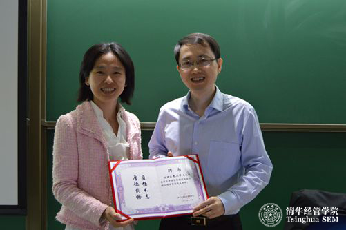 清华经管学院会计系罗玫教授向朱卫华先生颁发“资深实践导师”聘书