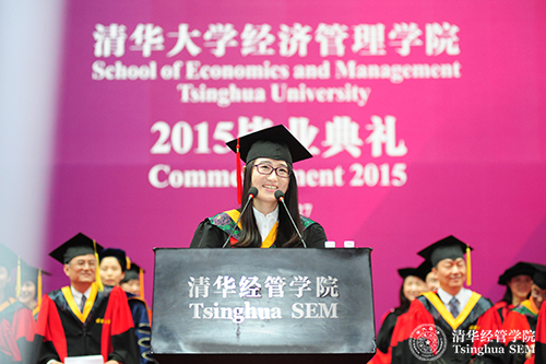 大家好!我叫贾思雪,这是我在清华园里的第九年,本科四年、博士五年的生活让我对这里充满了爱。今天,作为传说中的第三类人——女博士,我感到非常荣幸能够代表本届博士毕业生在此发言。我还要向坐在看台上的我的丈夫——传说中的第四类人致敬,祝贺我们一同博士毕业!