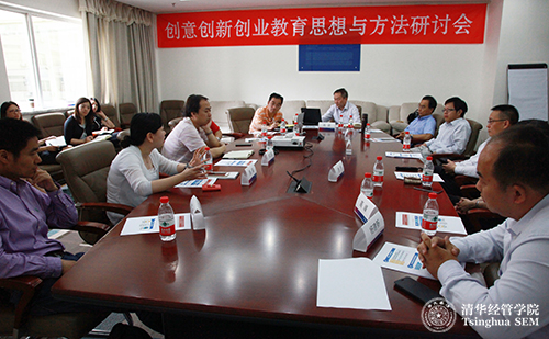 2015年5月21日,创意创新创业教育思想与方法研讨会在清华大学经济管理学院舜德楼306室举行。来自清华经管学院、美术学院、基础工业训练中心的十几位老师参加此次研讨会,就日前出台的《国务院办公厅关于深化高等学校创新创业教育改革的实施意见》进行学习,并对清华大学目前三创教育的现状和未来发展方向进行了深入讨论。活动由清华经管学院创新创业与战略系副主任朱恒源教授主持。