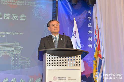 最后,清华经管学院北美校友会会长郭绍增(EMBA2010)致辞。他认为,清华经管学院北美校友会四个分会的建立是清华经管学院全球战略的重大里程碑。欣欣向荣的校友会充分体现了身在海外的清华学子依然是心系祖国,心系母校。并表示清华经管学院北美校友会在未来会“精诚团结,同心协力,共创辉煌”,为学院向世界一流学院的迈进做出贡献。