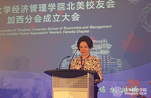 揭牌仪式后,清华经济管理学院北美校友会加西分会会长付敏英(EMBA2003)致辞。她表示加西分会将发扬秉承“自强不息,厚德载物”的清华校训,积极促进校友之间的交流,帮助校友们在加拿大安居乐业,不断进取,拓展事业,积极融入主流社会;将在清华经管学院校友会的指导之下,以实际行动持续提升清华经管学院品牌的国内外影响力,以增强对社会发展的贡献为己任,为促进加拿大和中国的商贸文化交往做出贡献。