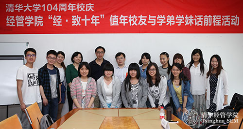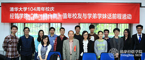 2015年4月25日下午,清华大学104周年校庆“启航人生:清华经管学院值年校友与学弟学妹话前程”系列座谈会举行。此次活动由清华经管学院校友办、学院团委、以及四个学生协会(金融协会、经济学会、信管协会、会计协会)共同组织,学院经1985级、经1995级和经2001级的9位校友重返校园,通过问答形式与学弟学妹们进行交流,分享了自己的学习与工作经历,共话前程未来。