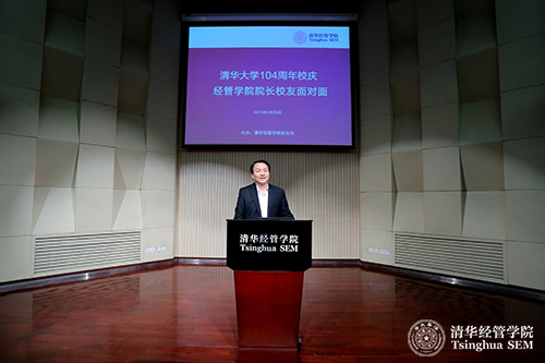 2015年4月25日下午,在清华大学104周年校庆之际,“经管学院院长校友面对面”活动在清华经管学院伟伦楼报告厅举行。清华经管学院院长钱颖一教授与校友一起共话学院发展,聆听校友心声。活动由清华经管学院党委书记、副院长高建教授主持。