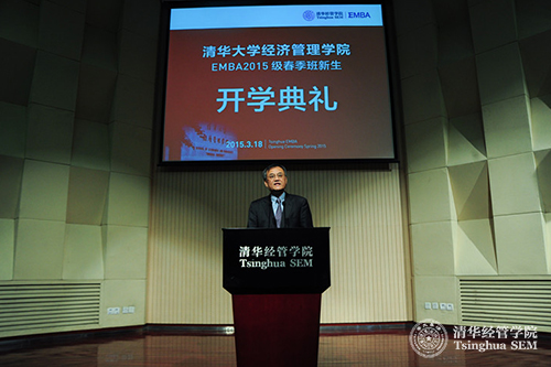 2015年3月18日下午,清华大学经济管理学院EMBA2015级春季班开学典礼暨入学导向在伟伦楼报告厅举行。来自全国各地近200位清华EMBA的新生齐聚一堂,共同见证自己成为清华人的庄重时刻。清华经管学院院长钱颖一教授、EMBA教育中心主任王勇博士、副主任贾莉、孙美琦老师,主任助理刘圣华老师等一同参加开学典礼。