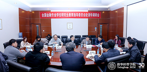 2014年12月17日,全国金融专业学位研究生教育指导委员会(以下简称“金融教指委”)赴清华大学调研会在经管学院伟伦248举行。金融教指委副主任委员吴晓求教授、清华经管学院副院长郦金梁教授、五道口金融学院副院长康以同教授、中央财经大学金融学院副院长李建军教授、对外经济贸易大学金融学院副院长潘慧峰教授、对外经济贸易大学国际经济贸易学院副院长许亦平教授、清华经管学院金融硕士学术主任刘淳教授、金融系王浩教授、五道口金融学院教学办主任李静芳、经管学院硕士项目办公室执行主任张亦萌、金融教指委秘书处办公室刘庭竹等出席会议。金融教指委常务副秘书长赵锡军主持了会议。