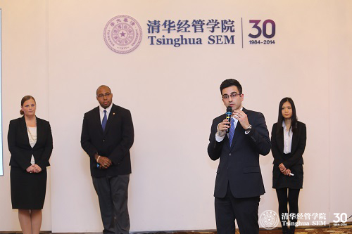 决赛开始前,首先由清华经管学院党委副书记、创新创业与战略系焦捷教授致辞。焦捷教授提及此次大赛是经管学院历届所举办的校内管理案例大赛中规模最大的一次,创造了清华大学商业案例比赛的纪录。他认为,大赛具有双语、跨专业和中外学生共同参加的特点;从68支队伍中脱颖而出的12支参赛团队每支都是最优秀的;他相信今后清华大学的管理案例比赛水平会越来越高。