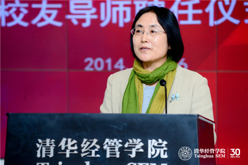 钱小军教授首先代表学院欢迎校友导师出席聘任仪式并介绍了学院近年来本科教育改革的情况。她说到:“学院本科教育改革今年9月获得国家级教学成果奖一等奖,这一重量级奖项的获得突显出清华大学特别是经管学院对本科教育的重视。”钱小军教授重申杨斌教授曾向校友导师提出的“五个一”要求,即每学期和学生面对面交流一次,每学期与学生共读一本好书,每年邀请学生参访一次自己的岗位,每年和学生出游一次,每年给学生写一封信。在此基础上,钱小军教授将“五个一”完善为“六个一”:每年请学生帮助做一件事。她指出校友导师对学生不仅仅是四年的陪伴,更应该是一生的指导,希望校友导师努力为学生提供接触社会的机会,帮助本科生更加深入地了解社会,得到更多课堂之外的教育,发扬清华薪火相传的传统。