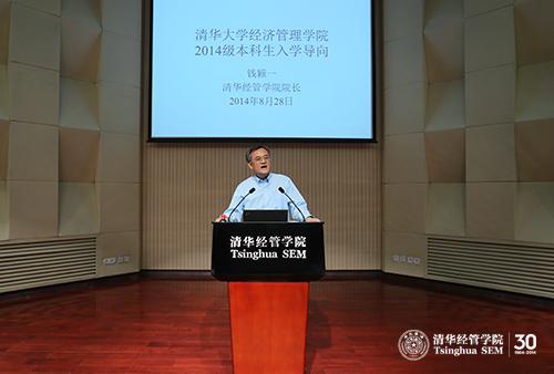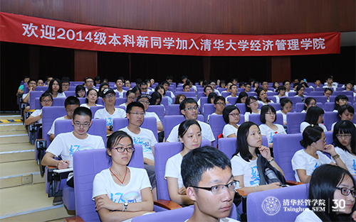 2014年8月28日下午,清华大学经济管理学院2014级本科生入学导向活动在伟伦楼报告厅举行。院长钱颖一教授、党委副书记焦捷教授、本科项目学术协调人、班主任及学院相关职能部门老师与全体本科新生和转系生一起参加了入学导向。教学办公室主任朱玉杰教授主持了本次活动。