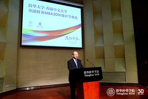 2014年8月30日上午,清华大学-香港中文大学金融财务MBA项目2014级开学典礼在清华大学经济管理学院伟伦楼报告厅举行。清华大学副校长谢维和教授、香港中文大学副校长许敬文教授与70名2014级新生一同参加开学典礼。典礼由清华经管学院副院长郦金梁教授主持。