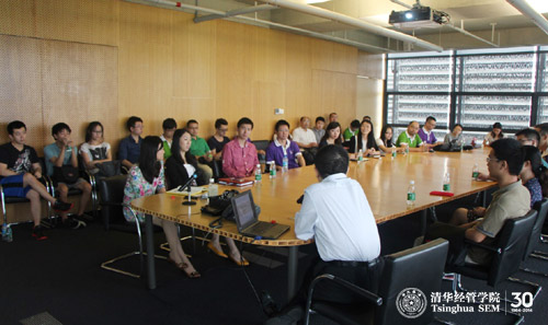 7月1日上午,清华x-lab创业深圳行师生一行首先来到腾讯总部。腾讯集团战略发展部战略分析师何迪亮与同学们进行了深度交流。他详细介绍了腾讯的发展历程、商业模式、发展战略和企业文化等情况,并与大家就腾讯QQ与微信的关系,微信群人数限制等问题进行了探讨。愉快的交流之后,大家参观了腾讯展厅。据讲解员介绍,本次参观路线完全按照2012年12月习近平总书记视察腾讯的路线,于是它有了一个好听的名字——“重走主席路”。