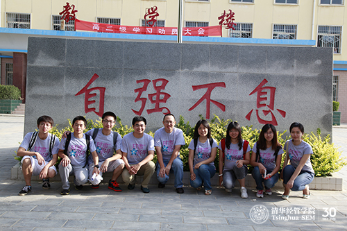 本次实践活动的目的地是甘肃省庆阳市合水一中。从2012年起,基金会已在合水一中发放助学金40万元,每年资助该校100名高中学生完成高中学业。2013年,合水一中共有31名受助学生升入了大学,今年又有8名受助学生高考分数超过了本科录取线。考虑到除了经济上的帮助,面临高考的学生和即将进入大学的学生还需要其他形式的帮助。这个暑假,清华经管学院两名已经毕业多年并已创业成功的校友带领着八名学生来到甘肃合水,用实际行动为当地的高中生送去关怀。