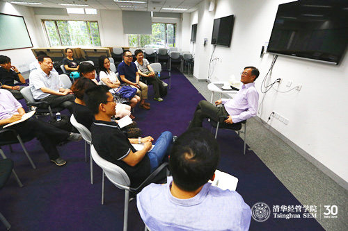 2014年5月30日晚,“院长下午茶”MBA学生专场在清华经管学院舜德楼116室举办,18名来自2012级和2013级的在读MBA学生参加了此次活动。钱颖一院长与学生交流的内容主要集中在管理教育的未来发展方向上,讨论了创意创新创业、推动在线课程和聘用具有实践经验的教师等管理教育未来新焦点的话题。