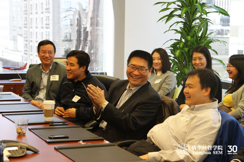 2014年4月26日,值清华大学经济管理学院建院30周年之际,学院50余位校友在纽约齐聚一堂,重叙手足情谊,回忆宝贵时光,同庆学院华诞。同时,多位海外校友代表就职业发展与人生规划与现场的年轻校友们进行了分享和交流。