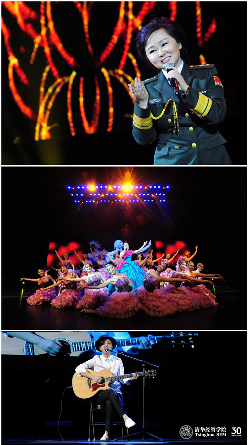 清华大学党委副书记史宗恺老师、清华经管学院院长钱颖一教授、第二任院长赵纯均教授、副院长高建教授、党委副书记焦捷教授、启迪控股党委书记李志强老师等到场和同学们一同观看了演出。晚会还邀请了学院教师职员、离退休老教师和报名院庆返校活动的各届校友代表等共同分享这场丰盛的视听盛宴,共同庆祝清华经管学院建院30周年。