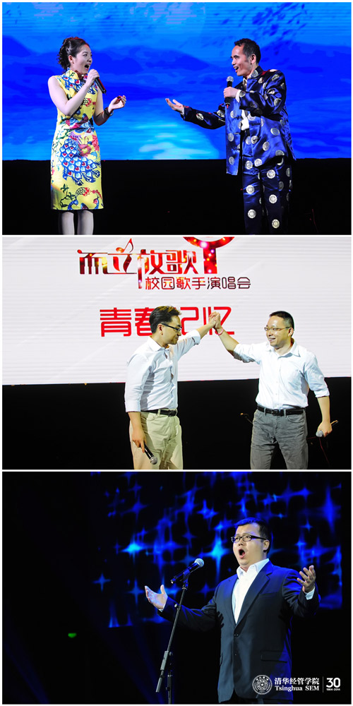 “而立放歌”集聚30年来活跃在清华舞台上的师生校友,囊括了30年来流行于校园的数十首代表性作品。通过歌声回顾30年来学院、学校和整个中国社会的风貌变迁成为本次晚会的主旋律。精彩的开场视频后,三位校歌赛冠军:魏晨阳(经1991)、董丁(经2003/MBA2011)、查迪(经2009/经硕2013)分别从舞台和观众席闪亮登场,演绎经典曲目:《光阴的故事》、《同桌的你》和《那些年》,瞬间把大家的思绪带回到歌声中的年代,以怀念和重温的情怀,拉开了“歌声飘过清华园三十年”的主题序幕。