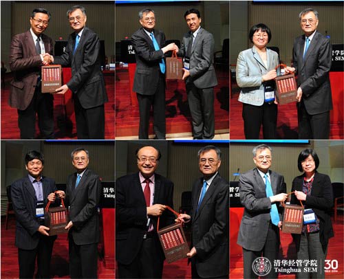 钱颖一教授在赠书仪式上说,在清华大学经济管理学院建院30周年之际,借此次管理学院院长论坛之机,向举办MBA和EMBA的全国236所MBA培养院校赠送朱镕基院长的著作《朱镕基讲话实录》。他表示,自己十分系统地读过这套书,深感受益匪浅。这其中体现了朱镕基院长治国治市的智慧、经世济民的智慧,对外交往、国际关系的智慧,同时,更有极为深刻的办学智慧。在这套《朱镕基讲话实录》中,有五篇文章是直接针对清华大学和清华经管学院的,显示朱院长的办学智慧非常高明。第一篇,1992年清华电机系建系60周年,朱院长作为电机系的毕业生为此写了一封信,其中提到“为人先于为学”的思想。第二篇,1994年经管学院建院十周年的题词,留在伟伦楼的墙壁上,提出“办世界第一流的经管学院”。第三篇是祝贺1995年陈岱孙先生95诞辰的一封信,陈岱孙曾长期担任清华经济学系的系主任。第四篇是在2001年顾问委员会会议上,提出“教师是根本推动力”。第五篇,在2001年6月朱院长辞去清华大学经济管理学院院长时,在清华大学的那次演讲中,他殷切希望清华人要“追求完美”。