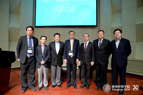 2014年4月25日,启程2014:变革与远见——清华经管学院企业家论坛在清华大学经济管理学院伟伦报告厅举行。中粮集团有限公司董事长宁高宁、复星集团董事长郭广昌分别做主题演讲,并与清华经管学院宁向东教授、朱武祥教授共同探讨正处于转型升级关键时期的中国企业的未来发展之路。论坛由清华经管学院高管培训中心和《清华管理评论》联合承办。
