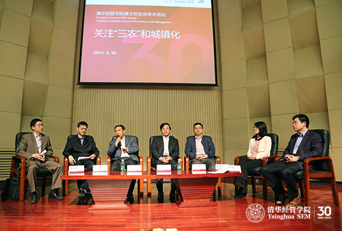 3月30日上午,清华经管学院博士校友会学术活动——“关注‘三农’和城镇化”在伟伦报告厅举行。中央农村工作领导小组副组长兼办公室主任、中央财经工作领导小组办公室副主任陈锡文和国务院发展研究中心副主任韩俊应邀发表了主旨演讲。清华大学党委书记陈旭教授、清华经管学院院长钱颖一教授为活动致开场辞。清华经管学院博士校友代表邓小清(经博1991)、贲金锋(经博1993)、申小林(经博1996)、吴晓亮(经博2007)和金鹏辉(经博2009)参加了主旨演讲后的互动环节。活动由清华经管学院党委书记杨斌教授主持。