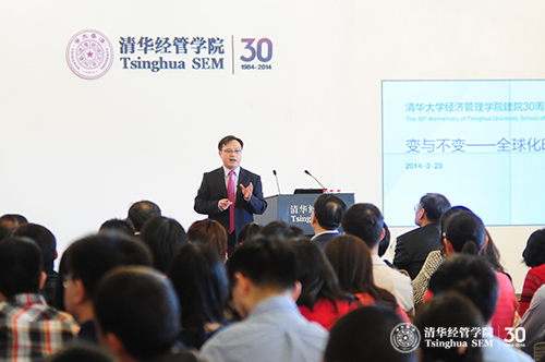 2014年3月23日,清华大学经济管理学院“思想•创新”院庆系列学术论坛:“变与不变——全球化时代的会计变革与管理创新”在学院舜德楼418举行。清华经管学院副院长夏冬林教授,德勤会计师事务所合伙人王鹏程,美国管理会计师协会中国首席代表白俊江,中国兵器装备集团副总经理、总会计师李守武,新华人寿保险公司副总裁、首席财务官陈国钢,北京大学光华管理学院王立彦教授,南开大学商学院副院长刘志远教授,中国人民大学商学院戴德明教授,清华大学经济管理学院于增彪教授分别从学术和商业的视角,分析了全球化时代的会计变革与管理创新。清华经管学院院长钱颖一教授,副院长高建教授出席了论坛,论坛活动由会计系主任肖星教授主持。