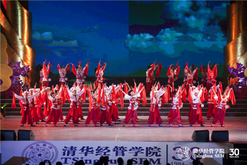 颁奖典礼结束后,晚会正式开演。清华腰鼓队表演的《吉祥腰鼓》拉开了晚会的帷幕。13-E班的歌舞串烧《青春旋律》以亮眼的舞蹈、动人的歌声展现了清华EMBA同学多才多艺的一面。