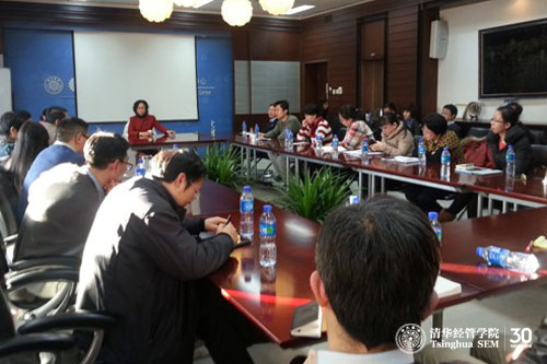 2013年12月17日,清华经管学院在舜德楼南405组织召开了国家基金项目申请与研究经验交流会。会议邀请到国家自然科学基金委员会管理学部冯芷艳老师,学院国家自然科学基金重大项目主持人、管理科学与工程系、EMC讲席教授陈国青教授,国家杰出青年项目获得者、管理科学与工程系徐心教授,国家杰出青年项目获得者、院长助理、市场营销系陈煜波教授,优秀青年项目获得者、管理科学与工程系肖勇波教授,以及优秀青年项目获得者、会计系薛健教授等就项目申请及研究经验进行交流。交流会由学院副院长高建教授主持,共有40多名教师参加。