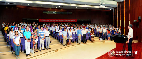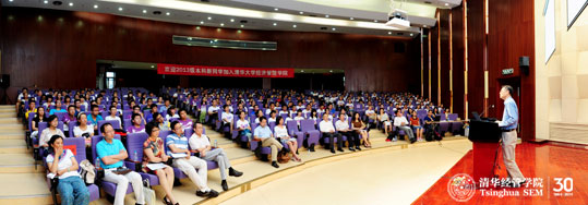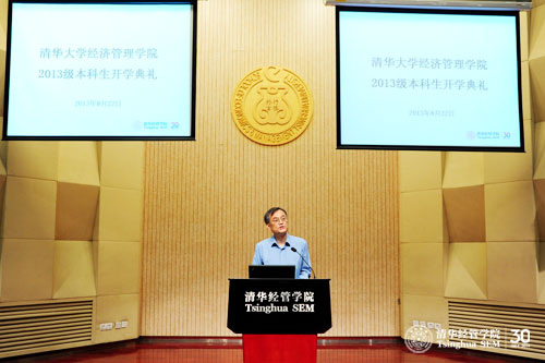 2013年8月22日上午,清华大学经济管理学院2013级本科生开学典礼在伟伦楼报告厅举行。院长钱颖一、党委副书记焦捷等教授出席了典礼并与250余名2013级新生共同见证了这一时刻。典礼由教学办公室主任朱玉杰教授主持。