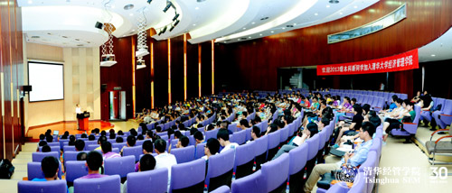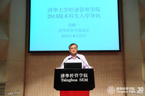 在讲话的最后,钱院长向同学们推荐了“两个书单”——“暑期书单”和《大学第一课》读本。“暑期书单”源自一位2012年级学生的建议,今年首次由钱院长和钟笑寒教授精心挑选后确定,是与清华大学录取通知书一起在一个月前寄发给所有2013级经管学院本科新生的十本推荐暑期读物。《大学第一课》是经管学院自去年开始为新生提供的入学导向阅读材料,内容涵盖清华名师谈治学、思考大学的作用、大学与人生(毕业演讲)等,旨在启发本科新生对“我的大学”、“我的未来”有更多思考和规划,也是对学院本科教育改革的进一步落实与深化。钱院长引用爱因斯坦的话“促进个性发展很重要,因为只有个人才能产生新的想法”("It is important to foster individuality, for only the individual can produce new ideas")、乔布斯的话“求知若饥,虚心若愚”("stay hungry, stay foolish")作为结尾,鼓励新一级的清华经管本科生自由成长,创造未来。