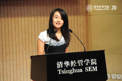 清华经管学院2013级管理科学与工程专业硕士王萌作为研究生新生代表与大家分享了她的清华梦。2012年夏天,还在中国人民大学求学的王萌参加了学院组织的夏令营,亲身感受到经管学院教授治学的严谨,经管学生的风度谈吐,让她对这里更加向往,“原来这就是清华,这就是经管学院”。入院学习后,她希望通过不懈的努力,不断提升自己,能为经管学院建设、为社会进步、为国家繁荣昌盛贡献自己的力量,践行经管学院“创造知识,培育领袖,贡献中国,影响世界”的使命。