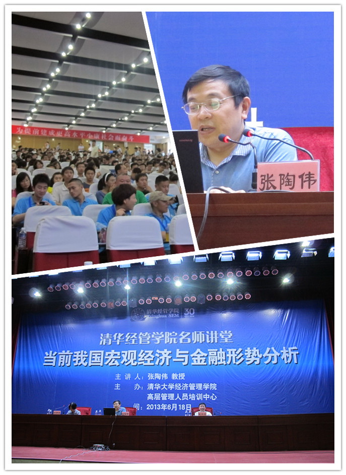 2013年6月18日,“清华经管学院名师讲堂”系列公益讲座移师黑龙江绥化。清华大学经济管理学院金融系张陶伟教授作了“当前我国宏观经济与金融形势分析”的主题演讲。本期讲堂作为清华经管学院高管培训中心中国企业家班移动课堂的特别课程,吸引了27、28、29期企业家班的三届学员近百人前来听讲。同时慕名而来的还有当地各行各业的企业界代表及清华经管校友等,一千人的政府大礼堂座无虚席。本次活动由清华经管学院高管培训中心主办,黑龙江省绥化市政府、市委组织部协办。清华经管学院高管培训中心常务副主任刘燕欣、绥化市委秘书长王兴彪等出席了此次活动并致辞。