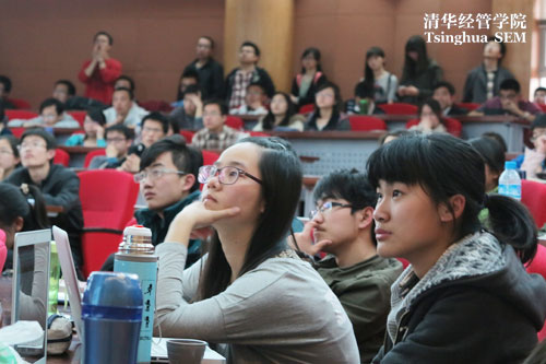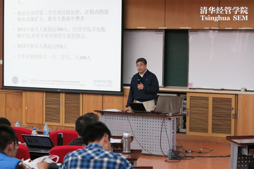 白重恩教授介绍了经管学院为经济学第二学位的同学们提供的丰富平台资源,从陈岱孙经济学纪念讲座、清华中国经济高层讲坛、中国经济50人论坛长安讲坛等学术活动,到“院长下午茶”、“冬情”学生节、经双篮球赛等课余活动,使同学们在其中拓宽知识视野、培养经济学思维习惯、享受集体归属感。宣讲会由经济学第二学位项目学术协调人杨思群教授主持。作为往届经济学第二学位的亲身参与者,来自清华大学医学院生物医学工程系的张钺同学(经双2010)结合自己在经双10班的学习经历和入选经管学院“优秀学术人才培养计划”的切身感受,与现场同学们分享了学习心得。