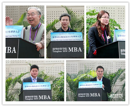 2013年3月23日上午,清华MBA校友会在清华大学主楼接待厅召开2013年理事大会。会议通过中期增选理事27名,常务理事17名,副理事长8名,审议通过了校友会2012年工作报告和2013年工作计划并颁发了集体贡献奖和特殊贡献奖。清华经管学院副院长郦金梁教授出席了上午的会议并致辞,清华MBA校友会常务副理事长龙大伟(MBA1993)在大会上做出专题报告,副理事长兼秘书长姜培兴(MBA1995)主持会议。来自香港、深圳、上海、成都、北京等16个地市的64名MBA校友理事以及校友嘉宾、MBA师生共84名出席了本次理事大会。