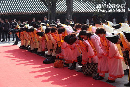 3月14日上午,同学们来到曲阜孔庙,身着传统汉服,在孔庙祭司的主持下参加祭拜孔子仪式暨国学班(第四期)开学典礼。清华EMBA教育中心执行主任王勇,副主任孙美琦,国学班(第四期)班级主管惠心,以及“儒”模块特邀授课教师美国维吉尼亚大学讲座教授陈明哲、台湾大学教授孙中兴一同参加了祭孔仪式及开学典礼。