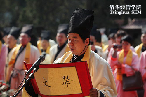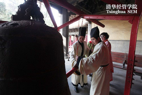 仪式伊始,王勇、孙美琦以及07-A班校友郑静晨一同击古钟三响,以示国学班第四期正式开课。随后,王勇代表所有参加祭孔仪式的师生庄重诵读祭孔祭文,并代表EMBA教育中心向参加国学班课程的同学们表示欢迎,希冀同学们在接下来逾一年多时间,通过七个模块的国学研修,学养精进更上一层楼。