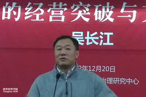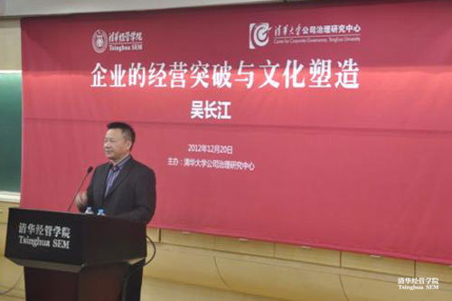2012年12月20日晚,应清华大学经济管理学院公司治理研究中心的邀请,雷士照明创始人吴长江先生来到经管学院,以“企业的经营突破与文化塑造”为题,与在场的一百多位同学和嘉宾进行深入的交流。本次清华大学公司治理系列讲坛由公司治理研究中心主办,中心执行主任宁向东教授主持了活动。