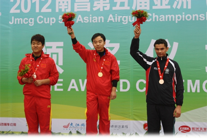 刘立龙(中)夺得男子10米气步枪个人冠军