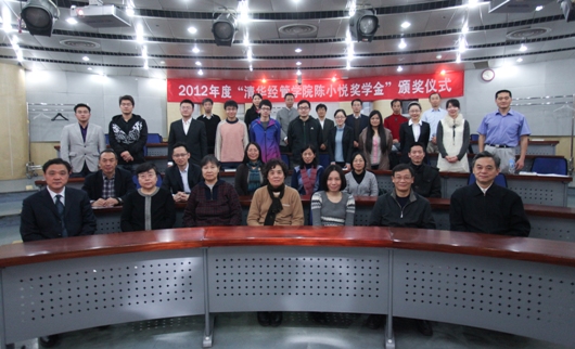 2012年11月26日,2012年度“清华经管学院陈小悦奖学金”颁奖仪式在学院举行。本年度共有10位本科生和研究生获奖。陈小悦教授的夫人郭凤梅女士和女儿陈萌女士、陈小悦奖学金基金常务委员会委员、陈小悦教授的学生和挚友代表参加了颁奖仪式。清华经管学院副院长夏冬林教授主持了活动。