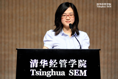 经94班彭陈晨同学首先作为老生代表发言。她以案例分析SWOT模型的形式向刚刚踏入清华园的学弟、学妹们回顾了自己大学三年来的体会,希望学弟、学妹们能够在未来的四年中好好发现自己的优势和劣势,珍惜各种机会,消灭各种威胁,完整充分地过好大学生活,并在“面临抉择之时,始终坚持做那个独一无二的自己,而不是那个活在他人眼中的你。”