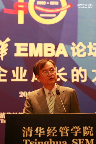 清华经管学院院长钱颖一教授致辞,他提到,经过十年,清华EMBA已经成为中国最具综合实力、最具口碑人气、最具影响力的EMBA项目。清华EMBA一直以培养产业领袖塑造企业未来为使命,十年来,清华EMBA形成了五大优势:强大敬业的师资阵容,广泛而雄厚的国际合作资源,精致的课程设计,严明的教学管理以及充满凝聚力的校友网络,这些优势已经成为清华EMBA品牌和声望的集成。同时,他还表示,清华EMBA具有三大特点: