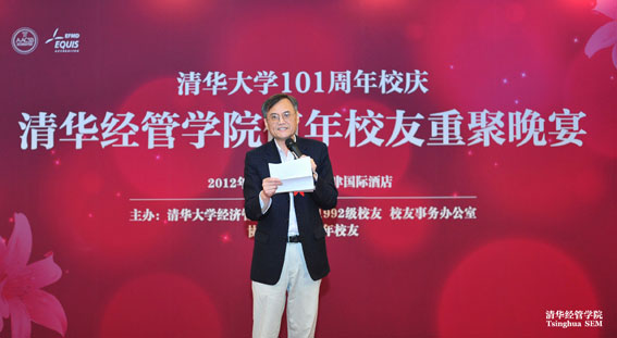 EMBA2002级校友刘俊君(美吉姆国际儿童教育中心中国区总裁)代表学院招收的第一届EMBA发言,他说过去的十年,是中国经济高速发展的十年。作为亲历中国大发展的EMBA同学,他们不仅见证了企业发展的辉煌,还肩负着更多的社会理想和责任。同时,他希望清华能够发展成为世界一流大学,清华经管学院能够成为世界首屈一指的商学院,清华EMBA项目能够成为世界一流的EMBA项目。