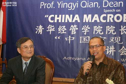 5月14日上午,清华大学经济管理学院院长钱颖一教授应邀做客印度尼西亚国家通讯社安达拉通讯社(Antara News),并用英文发表题为“中国宏观经济”的主题演讲。此次专题讲座由安达拉通讯社总裁穆克立斯(Ahmad Mukhlis Yusuf)博士主持。印尼政府各部会代表、工商会会员、媒体界、学术界、银行界人士、企业家及高层管理人员、高校师生等出席了演讲会。