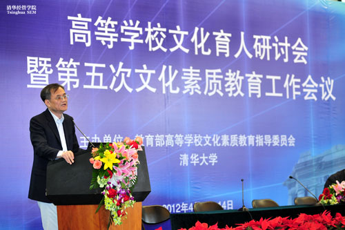 4月13至14日,由教育部委托清华大学举办的高等学校文化育人研讨会暨第五次文化素质教育工作会议在主楼报告厅召开。本次会议的重要内容之一是校院长论坛,分别由清华大学经济管理学院院长钱颖一、北京大学元培学院副院长卢晓东、复旦大学复旦学院副院长高效江、九江学院院长甘筱青等介绍近年来各校在本科教育方面的创新思路和实践经验。