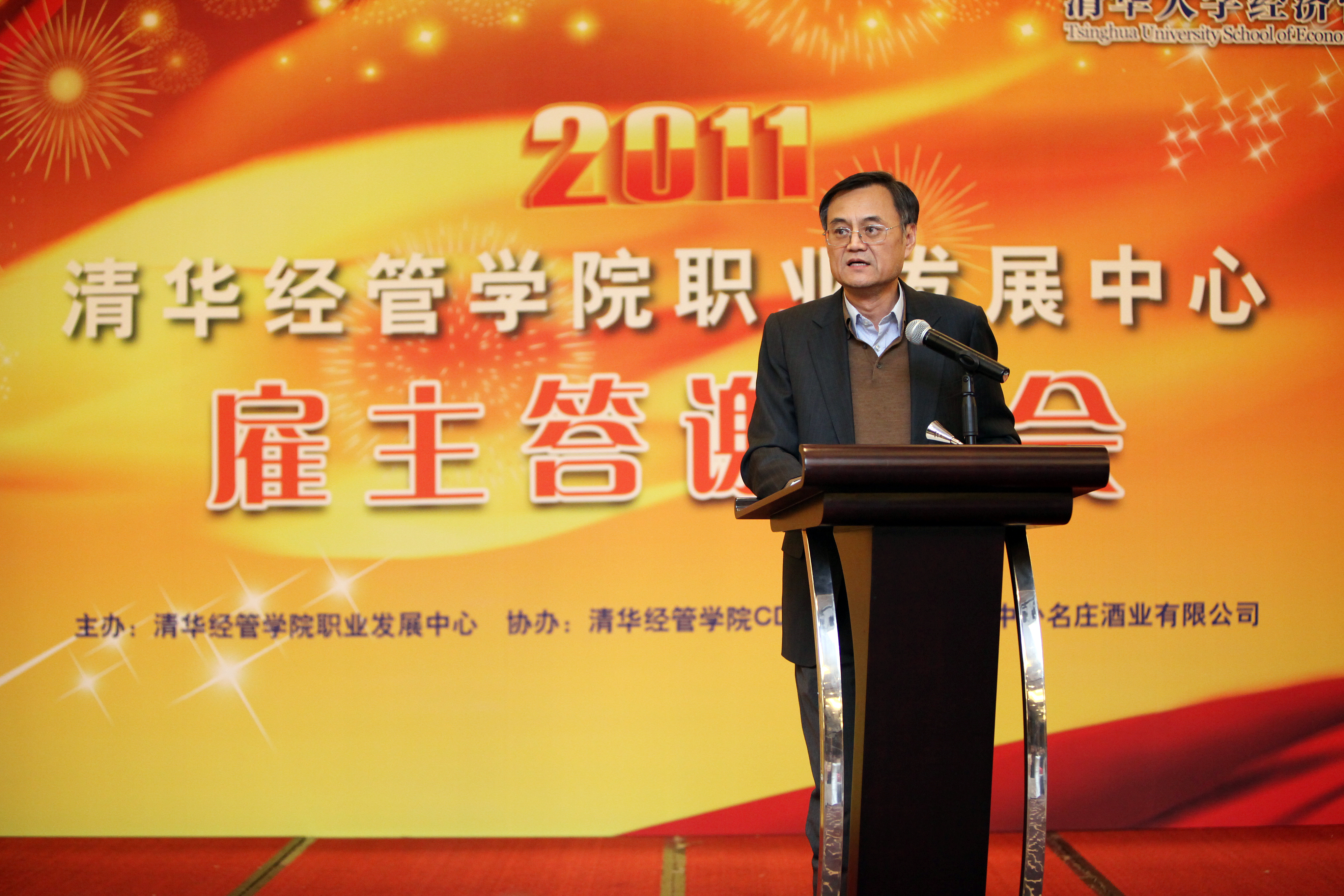 结束了当天下午的总结分享会后,雇主答谢晚会接踵开始。经管学院院长钱颖一致开幕词,钱院长首先向每一家为清华经管学院提供职业机会的雇主表示衷心的感谢,并对学院的职业发展工作取得硕果倍感欣慰。他提出,经管学院一直以来都十分重视和支持职业发展工作,并积极促进国际职业发展交流,为学生提供更加优质的职业发展服务。钱院长还说,今年正值清华大学百年校庆之际,经管学院也对其使命和教育理念下了新的定义。在"创造知识、培育领袖、贡献中国、影响世界"新使命的指导下,学院对教学项目,无论是课程还是招生方面,都进行了有效的调整。在增强经管学院的学生竞争力的同时,也为国家和企业输送更多的栋梁之才。最后,钱院长希望在座的各雇主能与经管学院开展进一步的合作与交流,争取让经管学院的职业发展工作迈上一个新的台阶。