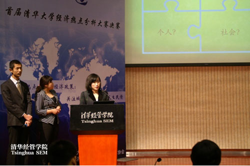 今年是“十二五规划”开局之年,比赛要求参赛选手以家乡经济社会热点和“十二五规划”为切入点进行经济政策的分析讨论。本次比赛共有来自23个院系的48支团队、共144名同学参加。晋级决赛的8支队伍按照“通过实证分析,给出政策评价,提出政策建议”的思路进行展示,对家乡发展提出了自己的看法和建议。答辩过程紧张严肃而又妙趣横生,十足地展现了清华学生的风采。同时,开放的决赛形式吸引了大批同学观战,现场观众的互动、思维火花的碰撞也进一步营造了比赛现场的氛围。