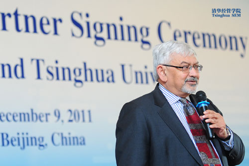 在当日下午举行的合作签字仪式上,学院党委副书记焦捷教授和CFA协会理事Charles Yang 先生分别致辞。焦捷教授和CFA协会亚太区董事总经理艾博科博士代表双方签署合作协议。CFA协会副理事长Alan Meder 先生、理事Aaron Low博士和理事邵征女士及清华经管学院2011级金融专业硕士学生代表参加了签字仪式。